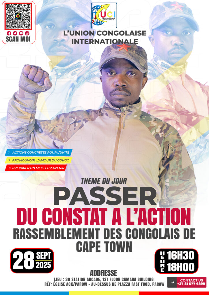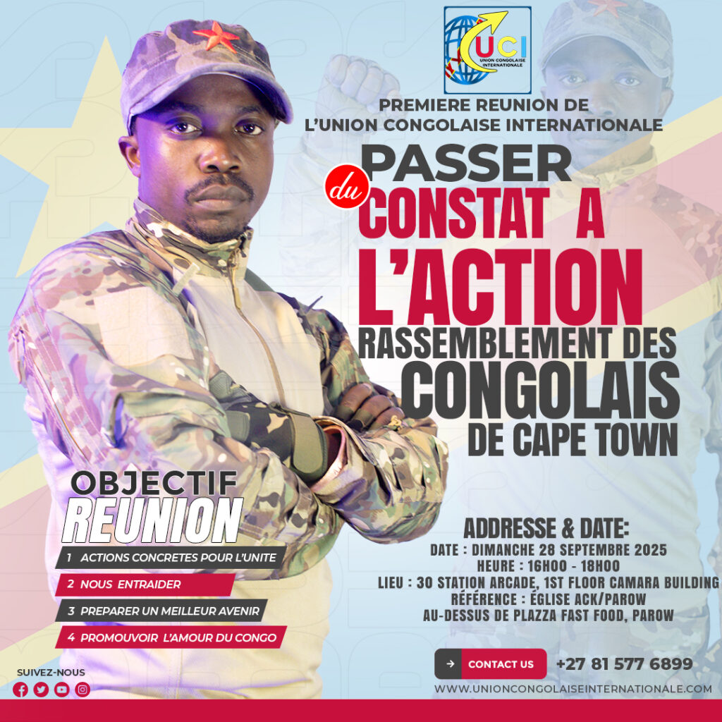 Le Cap, Afrique du Sud – L’UNION CONGOLAISE INTERNATIONALE (UCI) est heureuse d’annoncer les détails de sa première réunion officielle à Cape Town, un événement capital visant à unir et à dynamiser la communauté congolaise en Afrique du Sud. Ce sommet, prévu pour le Dimanche 28 septembre 2025, sera placé sous le thème puissant et mobilisateur : « Passer du constat à l’action ».